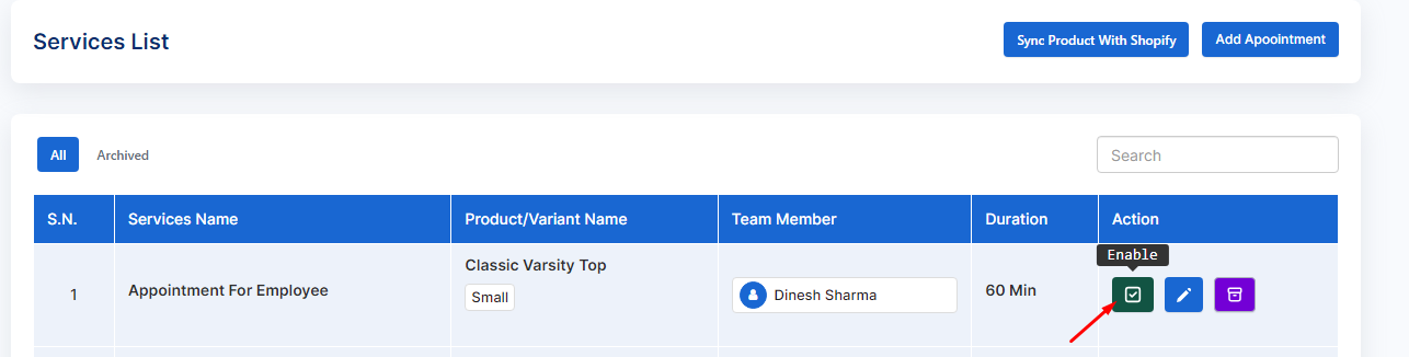 Alternatively, you have the option to activate or deactivate the appointment status for individual appointments from service option as well as service list.